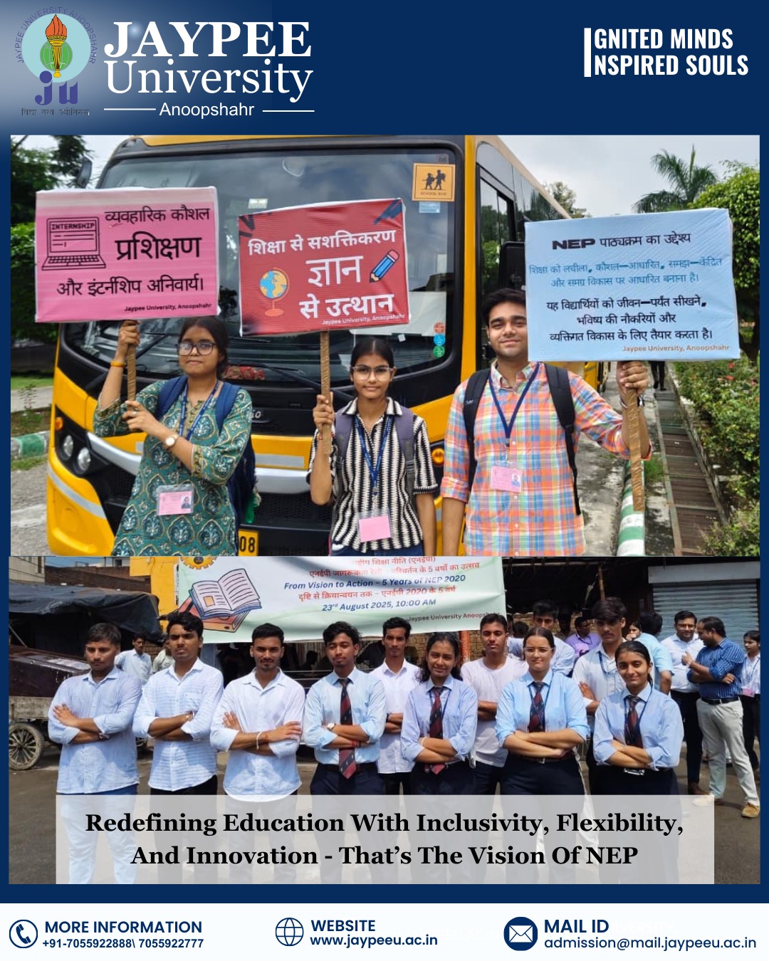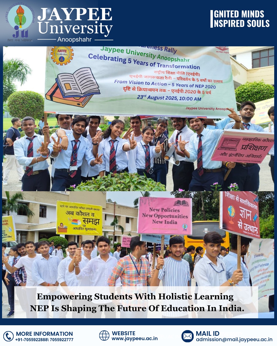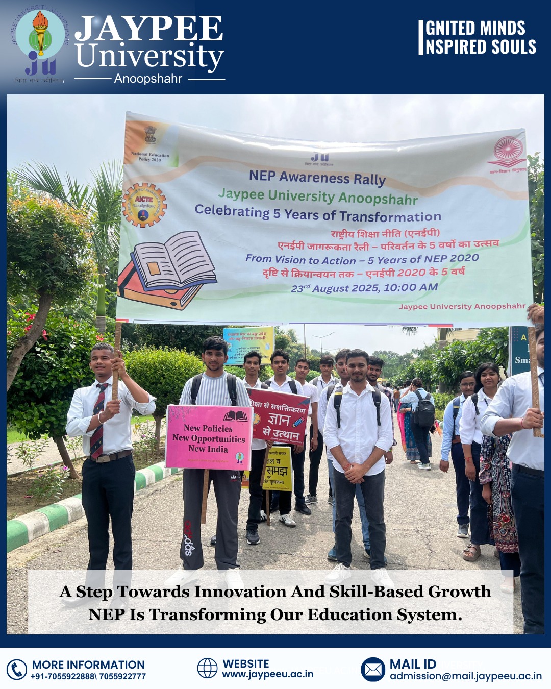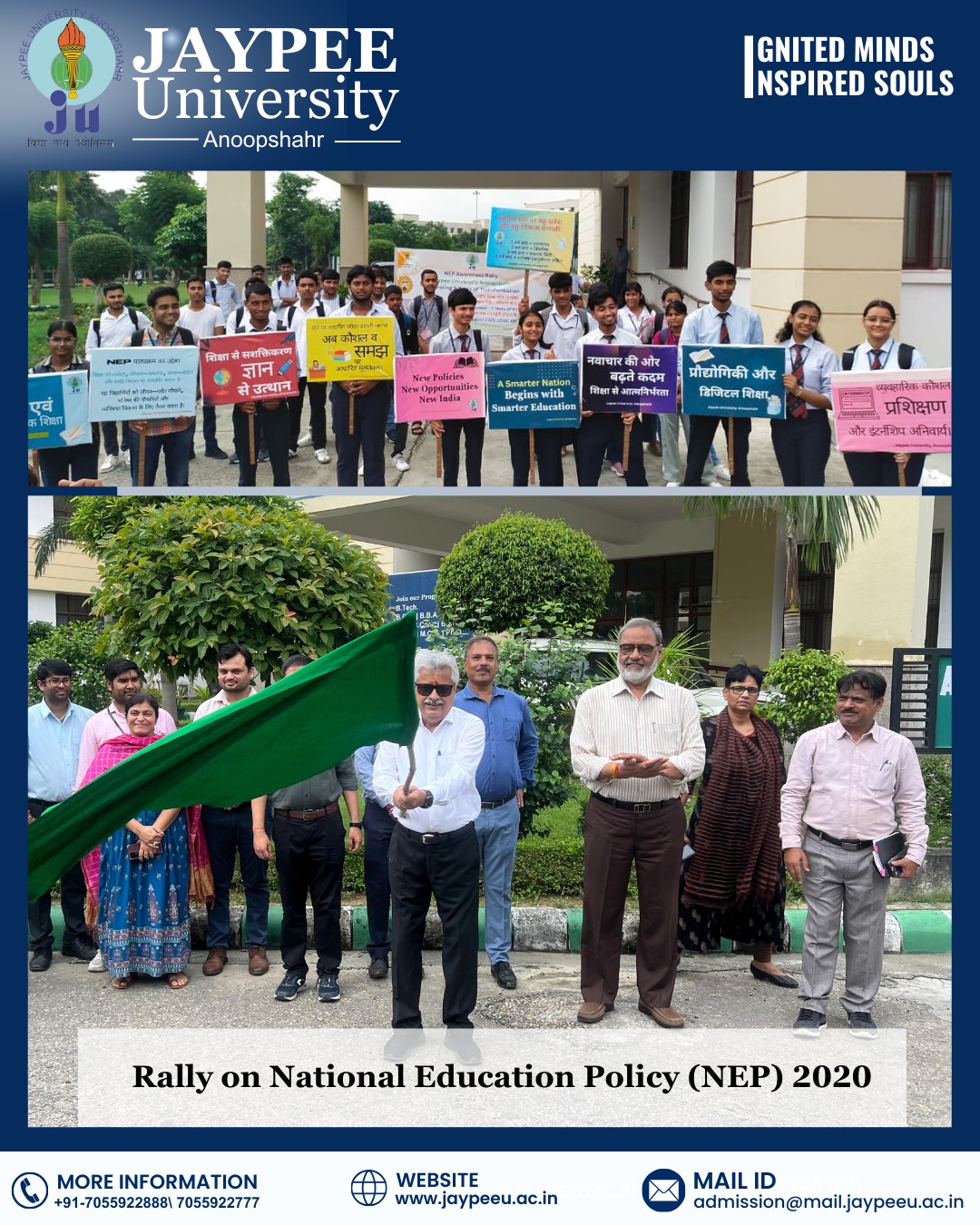 On 23rd August 2025, Jaypee University Anoopshahr organized an Awareness Rally on the National Education Policy (NEP) 2020. The rally was flagged off by Mr. V. N. Jha (Head HR, Jaypee Group of Institutions), Prof. Rajiv Saxena (Vice Chancellor), Mr. Sanjay Aggarwal (Registrar), Dr. Nishant Srivastava (Associate Dean), Mrs. Neena Chaturvedi (Principal), Dr. Priyanka Jha (NEP Coordinator) along with esteemed faculty members.
